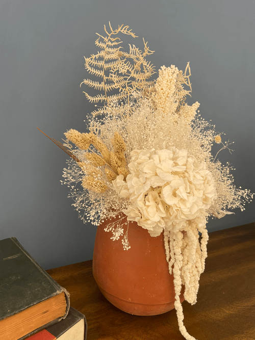 Maceta de barro natural con proceso 100% artesanal. Flores y follajes preservados en color hueso, con duración de al menos 3 años.